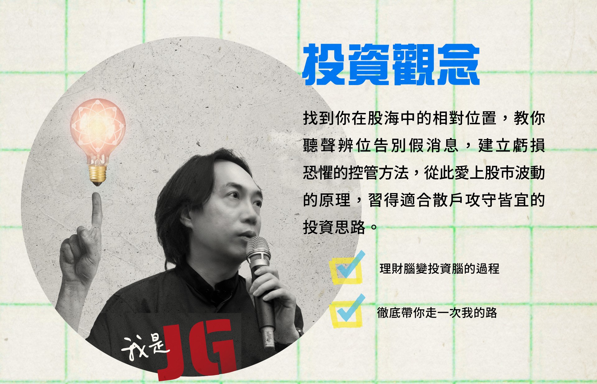 這堂課,要你透過 JG 老師的「視野」去看股市,我們將帶你展開有趣且具挑戰性的課程,剖析解密 要跟別人不一樣的「反市場」究竟是什麼,學會用「超科學」的判斷去下策略,告別情緒化的投資,讓每筆交易都能更具信心。從此你可能發現投資是一個令人滿足的愛好。