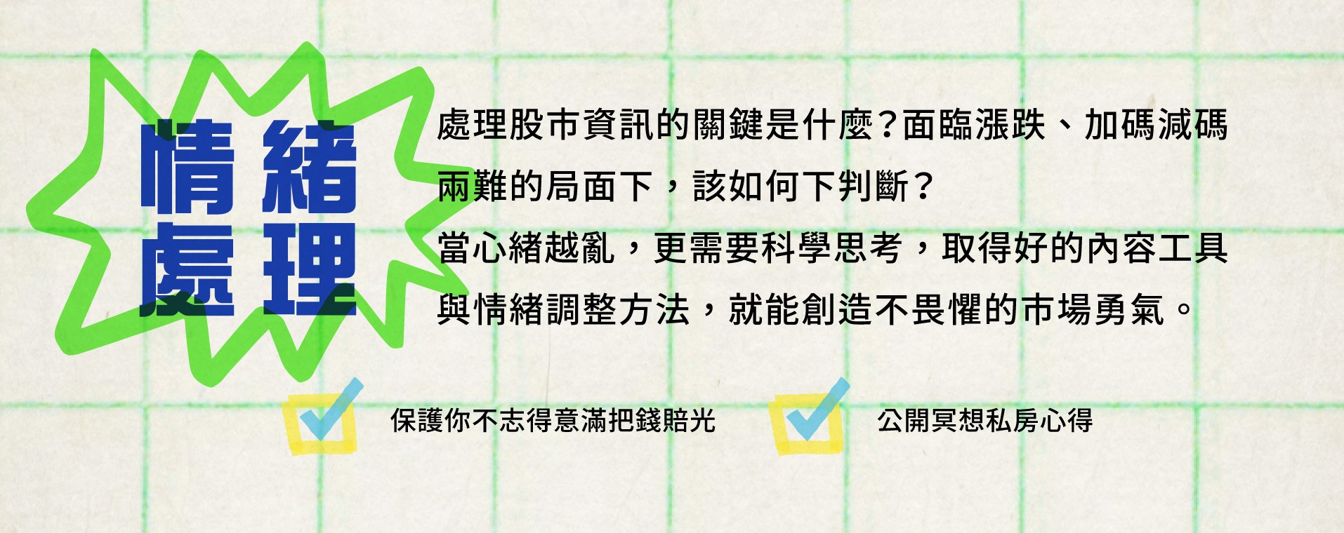 心理狀態對交易有著巨大的影響,因為股市永遠不知道未來會發生什麼,未知就是無法掌握,而面對未知是人類最深層的恐懼,因為恐懼你會混亂,事後看會覺得自己愚蠢到不行,該買時沒買或賣太早,這些心理問題是需要跨越的心理瓶頸,這時候透過系統化的訓練有助你平穩情緒,這些技巧不僅能夠在股市交易裡運用,在你的日常生活裡也能夠成為一大助力。